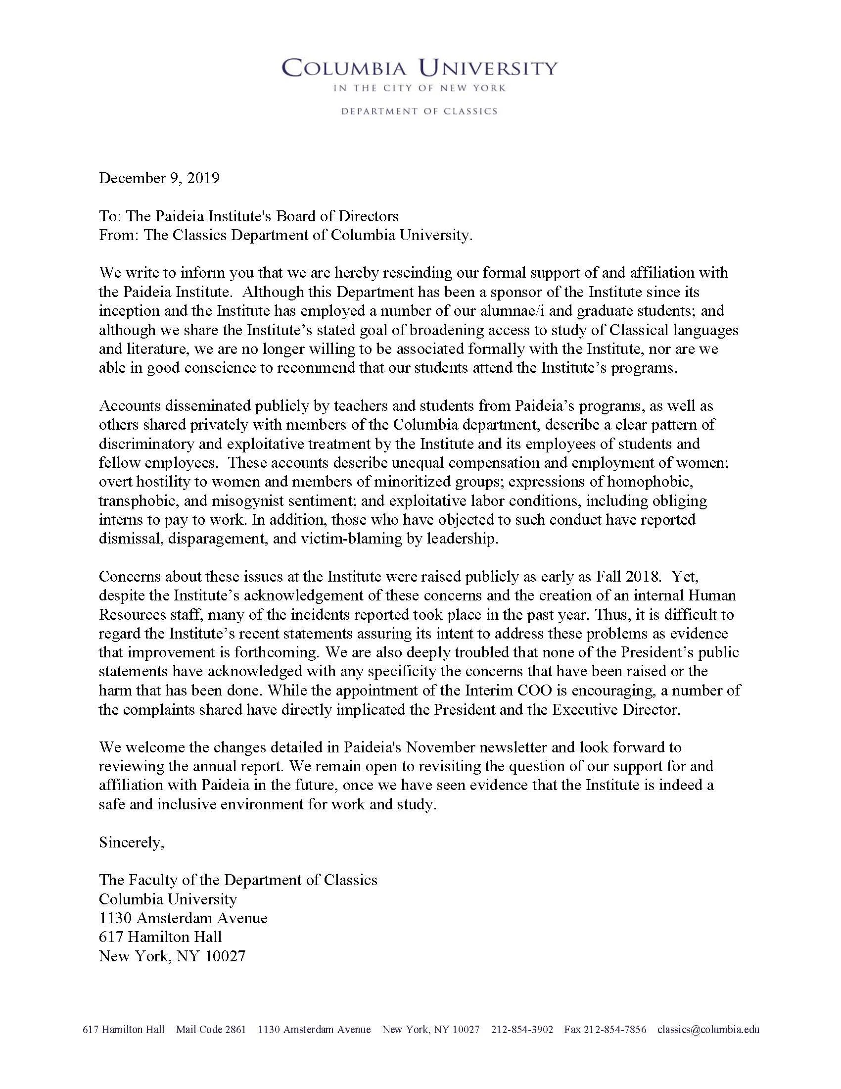 The department aims to encourage broad access to the ancient languages, their modern reception, and participation in the field. We understand such practices to be in keeping with a general commitment to combatting discrimination and harassment within the department, the discipline, and the wider academic community. You can find the full statement on diversity and inclusion here. Update June 2020: Black Lives Matter. The Department of Classics at Columbia University wishes to issue this statement of solidarity, although we recognize that simply printing such words—as true and heartfelt as they are (tragically) necessary—comes close to repeating the hollow adage of “thoughts and prayers”. We are currently working to develop and implement a program of substantive curricular and institutional reform, addressing race and racism, and involving immediate and future action. Due to the impact of the COVID-19 crisis, the Department of Classics will not be accepting applications for Ph.D. admissions in Fall 2020 for the 2021-22 academic year. We will re-open PhD admissions in Fall 2021 for the academic year 2022-23. Please note that the M.A. in Classics will continue to accept applications for 2021-22 admissions. For all further information, please contact Nancy Worman (nworman@barnard.edu), John Ma (jtm2179@columbia.edu), or any member of the faculty in Columbia Classics -- as always we welcome enquiries about graduate work and the Department more generally.Lectures, Drama, Collections