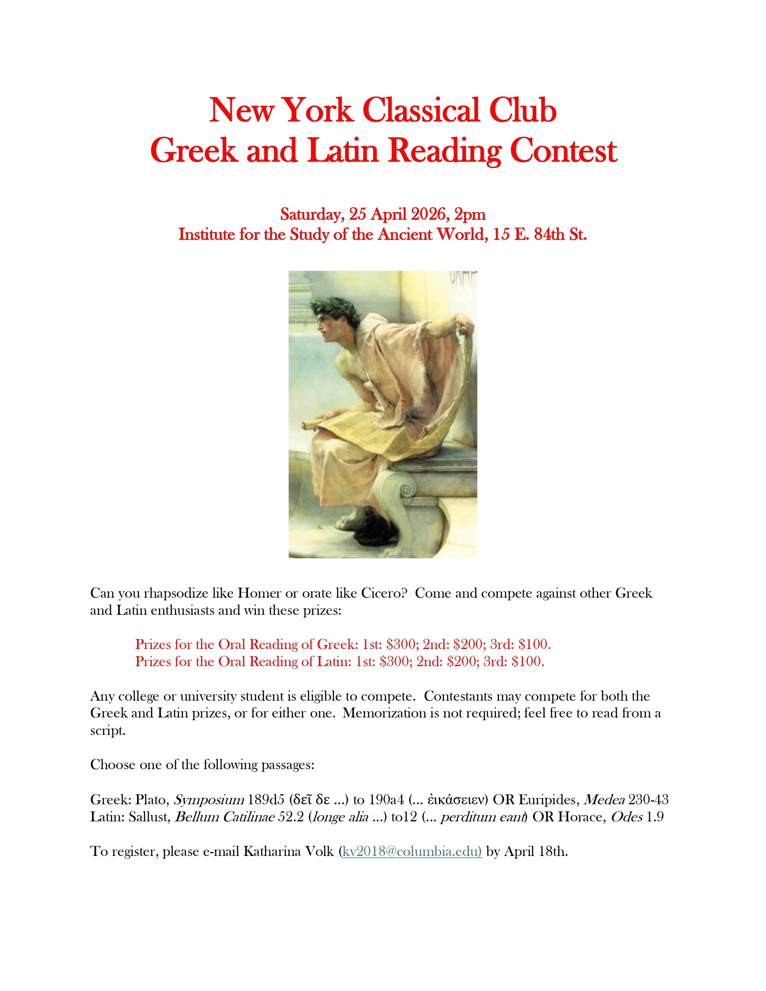 Any college or university student is eligible to compete. Contestants may compete for both the Greek and Latin prizes, or for either one. Memorization is not required; feel free to read from a script.